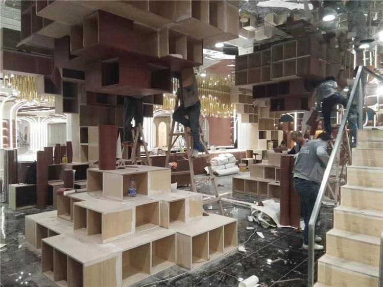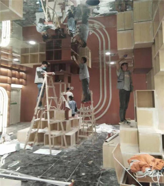 做這種造型設計最重要的就是一定要將邊角的部分壓實,否則空氣進入導致空鼓或者木紋膜脫落都會影響建筑整體的美觀性,所以前期的準備工作也是很重要的。