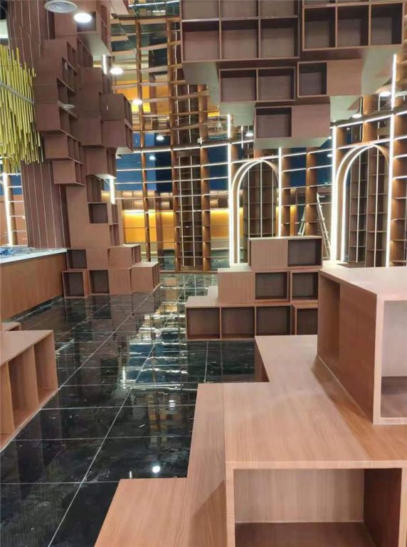 書店、展廳、店鋪如果要做出這種多格子的建筑設計,最能體現環境氛圍的就是用木紋紙覆蓋建筑表面,達到色彩統一、質感高級的視覺效果。